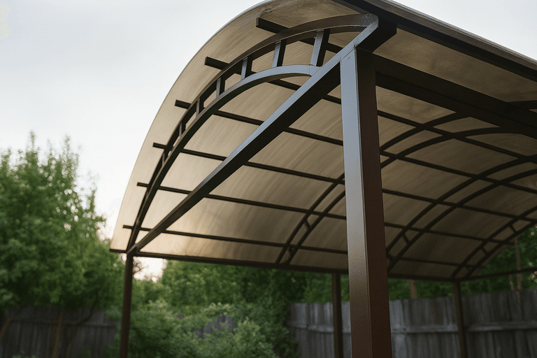 Изготовить навес из профильной трубы можно в короткие сроки — технология позволяет точно рассчитать нагрузки и обеспечить надежность конструкции. Такие навесы подходят для небольших участков и просторных парковочных зон.